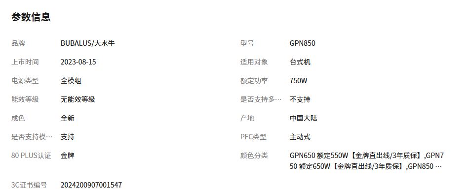 产品名称 : 大水牛电源GPN850金牌全模组
